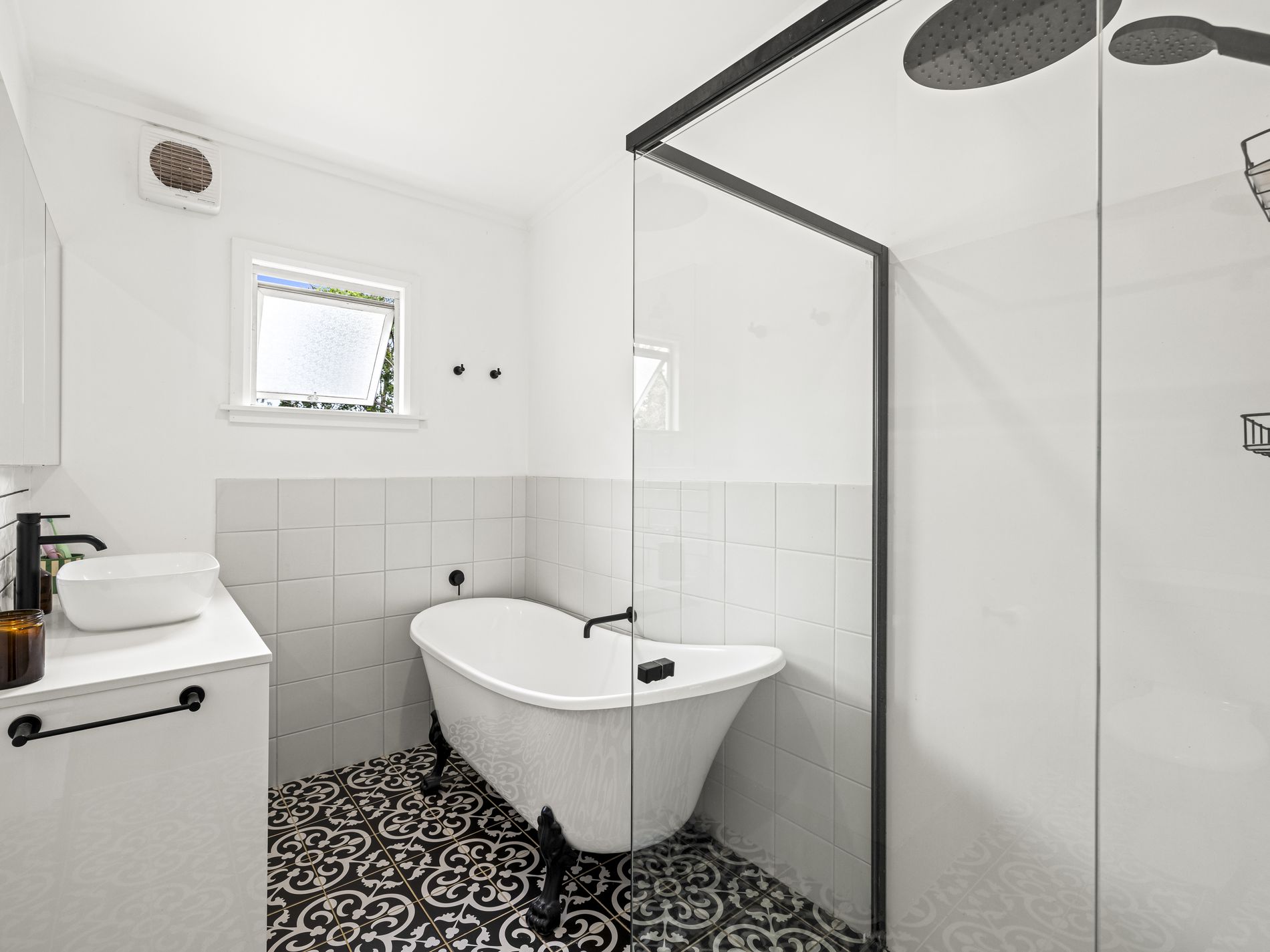 - Renovated bathroom with clawfoot bathtub and separate shower